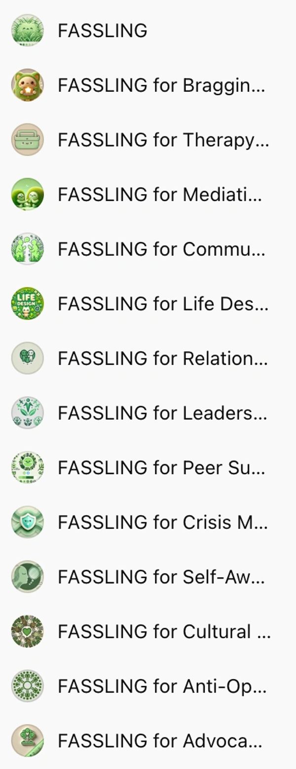 I understand that emotional and life coaching support alone is not sufficient to create a psychologically safe space. That's why I have developed a range of FASSLING™ AI products focused on building holistic essential life skills. Feel free to use the FASSLING AI product line to practice any skills, and use FASSLING™ emotional and life coaching support to process any emotions, feelings, or thoughts that may arise while learning these skills. At this moment, FASS’s entire AI product line has formed a perfect, complete system. FASSLING™ will continue to work hard to provide 24/7 support year-round, striving to create a safer space for everyone. I invite you to visit the official CHATGPT store to access the FASSLING™ AI programs. If you find them helpful, please feel free to recommend them to others in need!